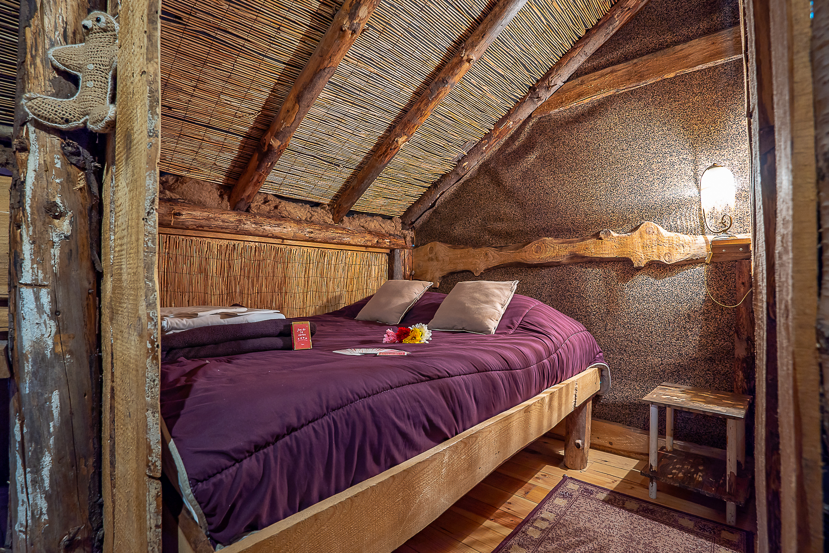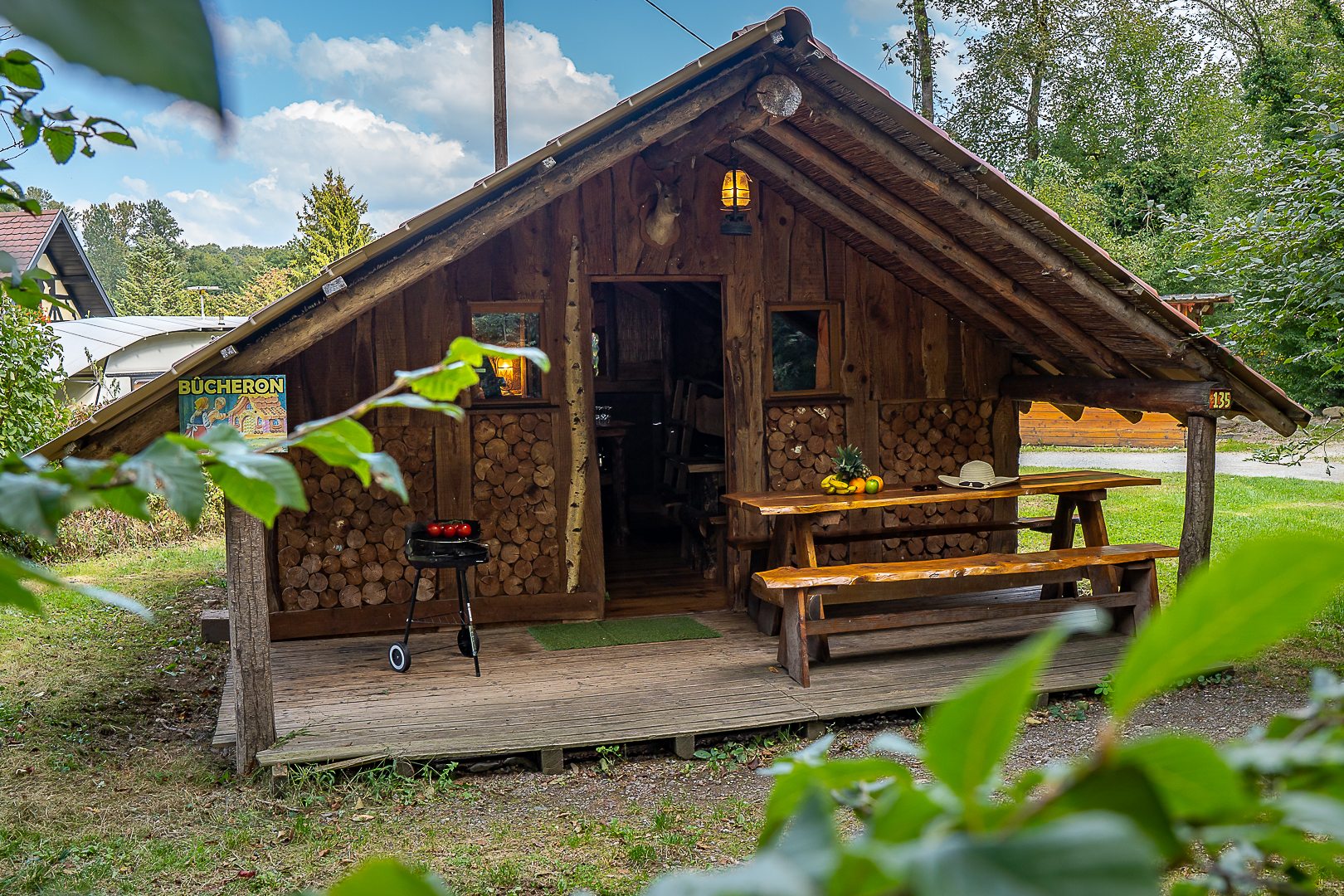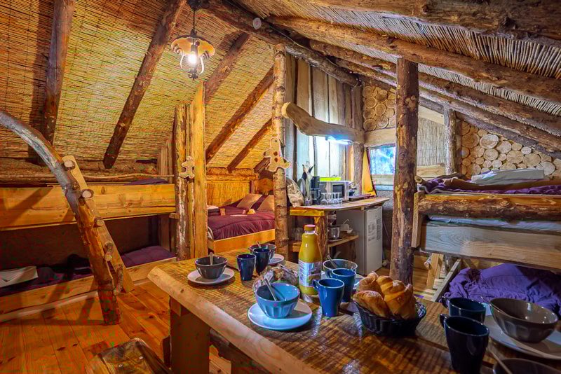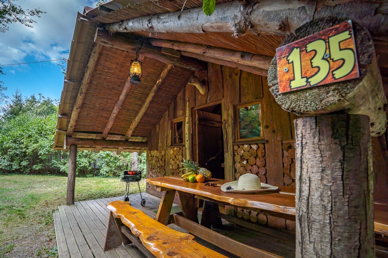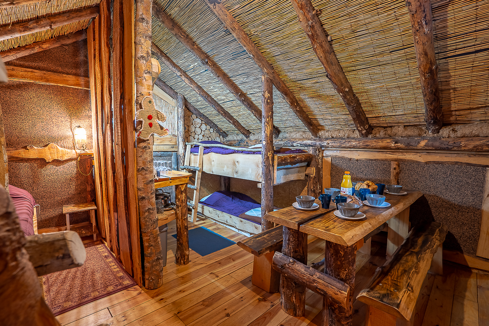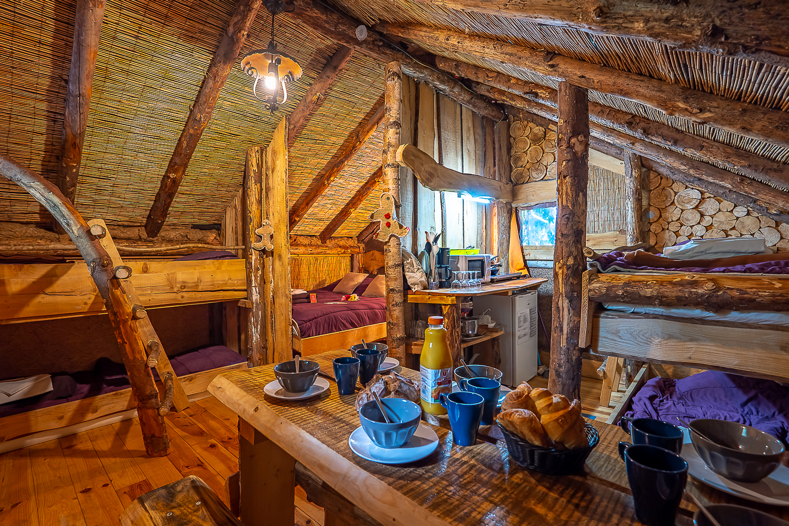 Séjour avec 3 coins chambres dont 1 lit double et 2 lits superposés, 1 coin cuisine/repas, douches aux sanitaires communs et 1 terrasse couverte