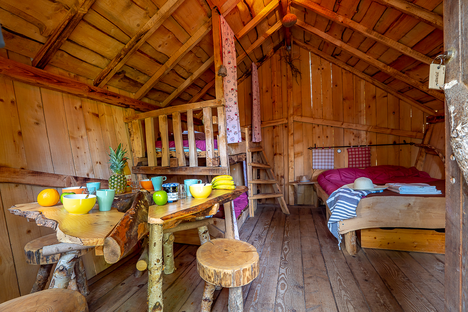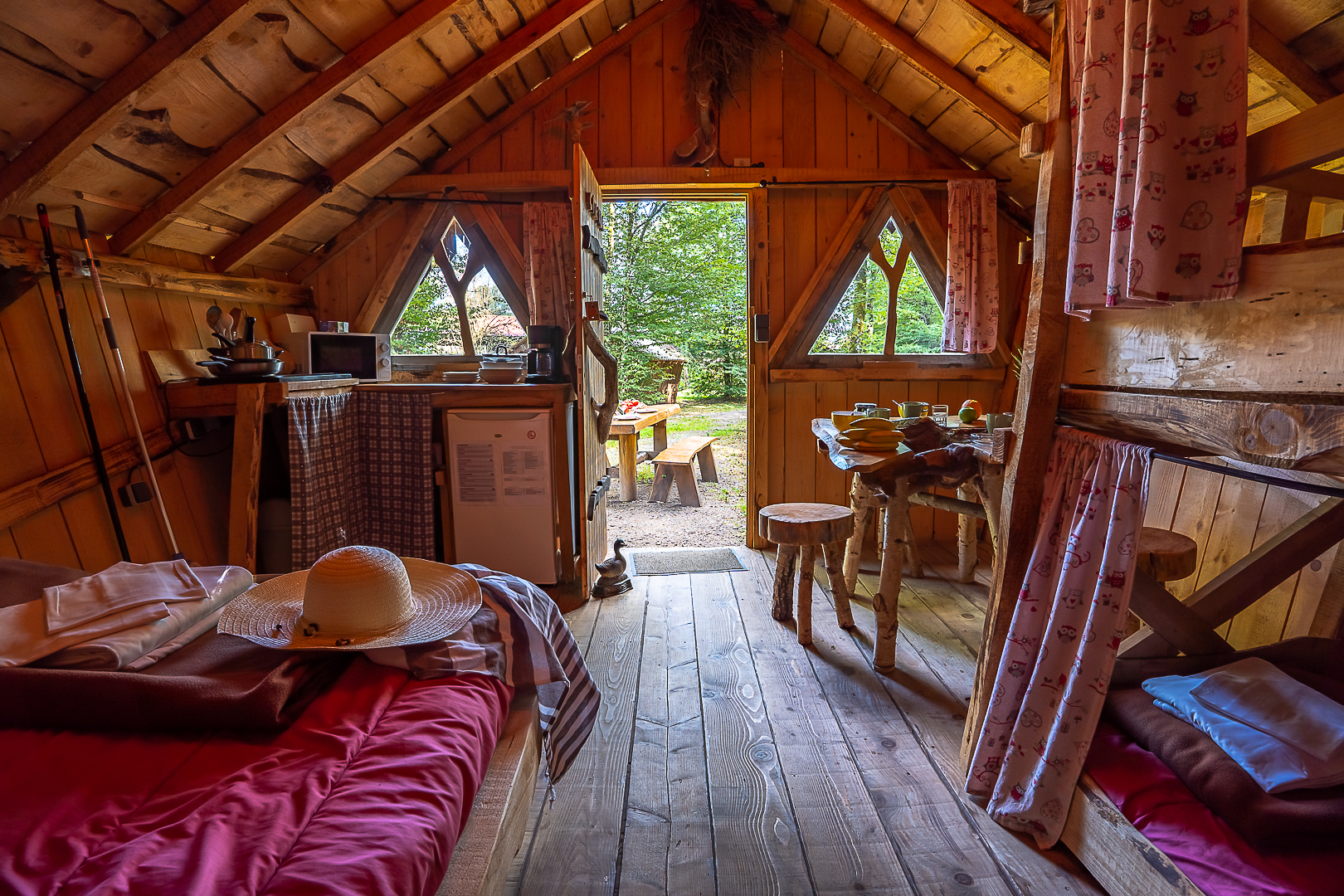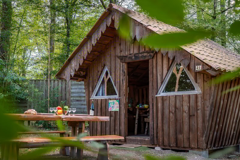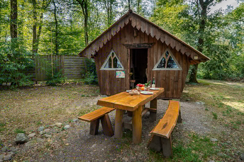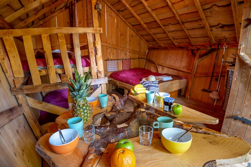 Séjour avec 1 lit double et 1 lit superposé, 1 coin cuisine et repas et douches aux sanitaires communs et petite terrasse