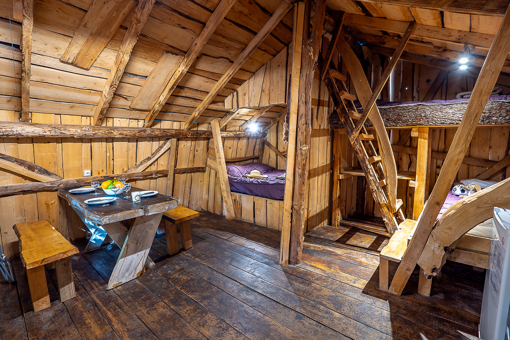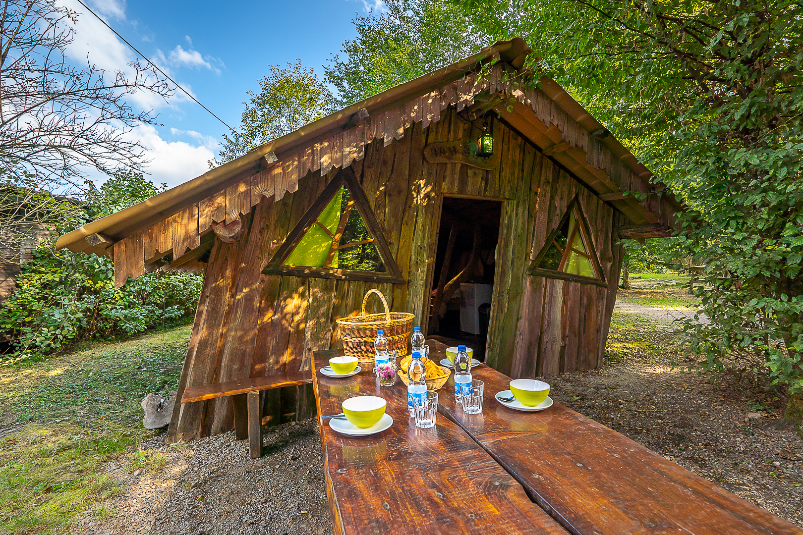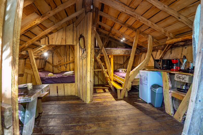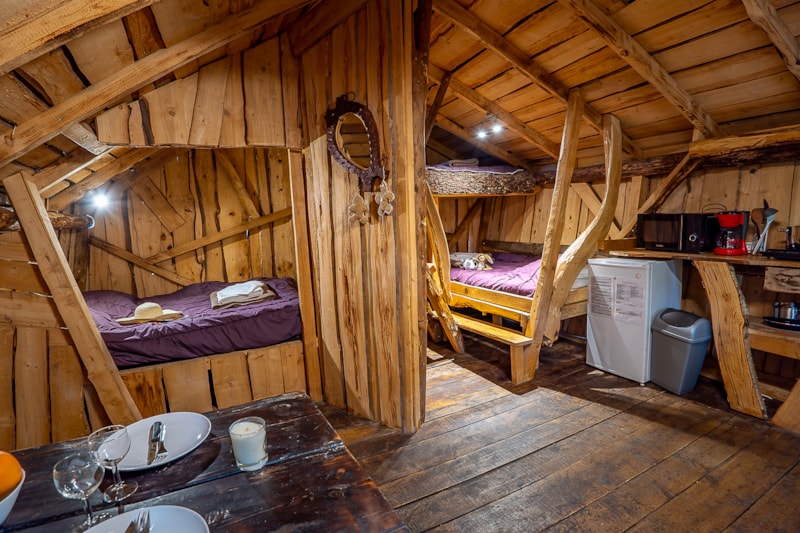 Séjour avec 1 lit double et 1 lit superposé, 1 coin cuisine et repas, toilettes sèches et douches aux sanitaires communs et petite terrasse