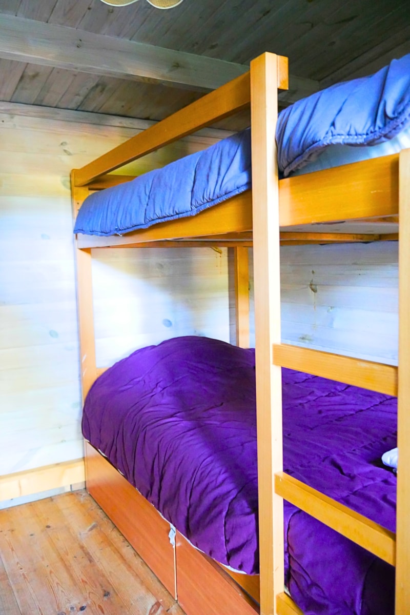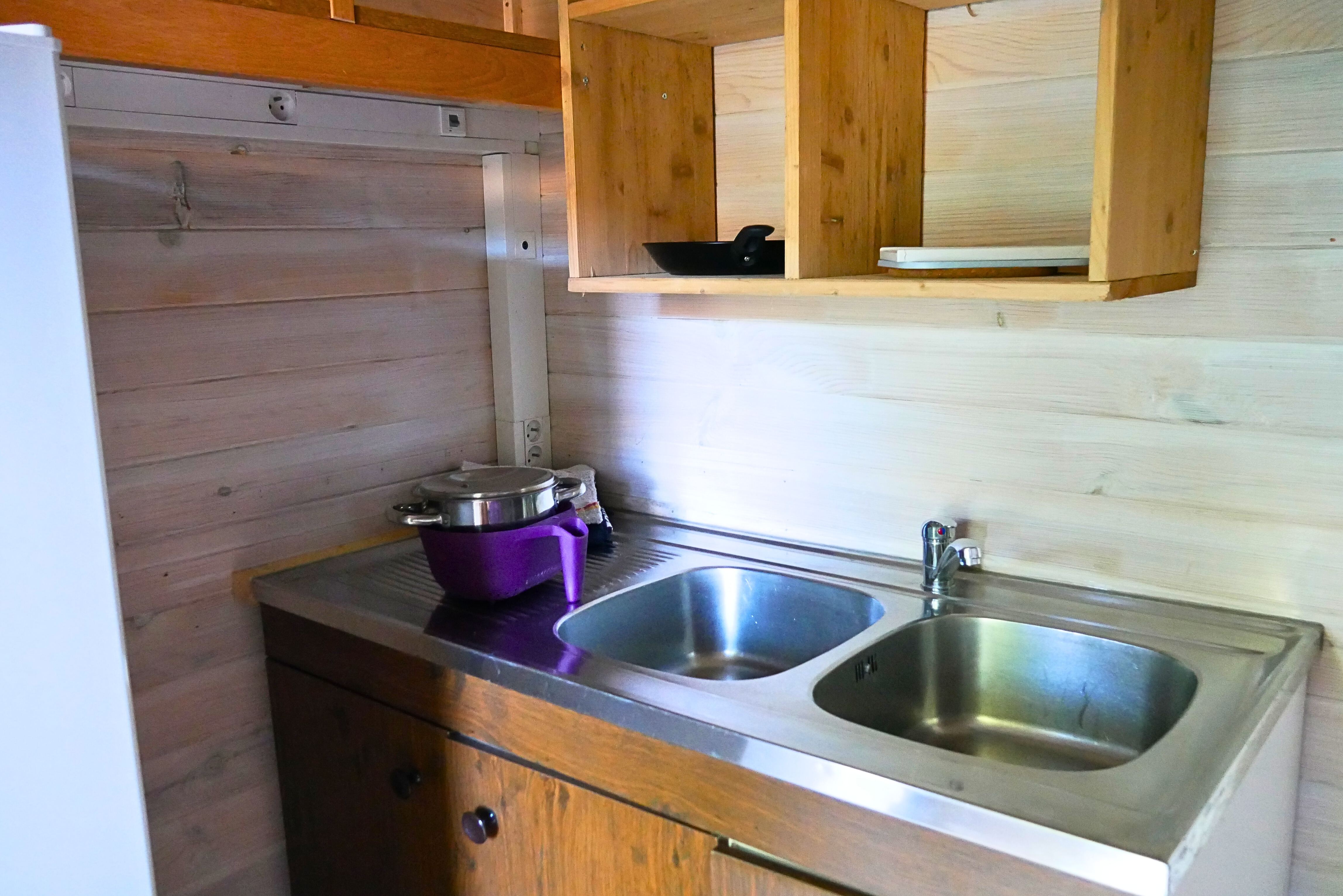 Pièce avec 1 lit superposé, 1 coin cuisine/repas, douches aux sanitaires communs et petite terrasse