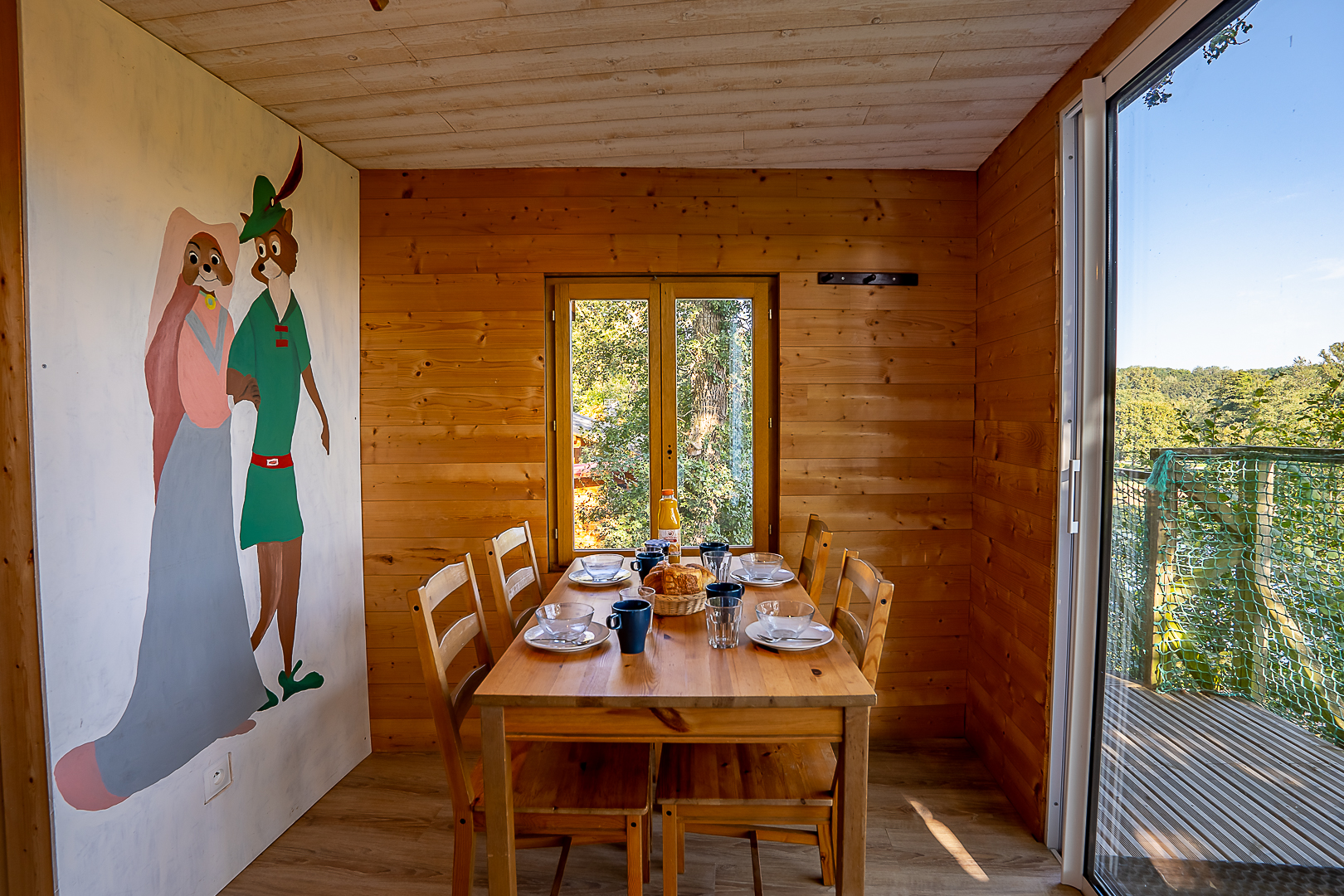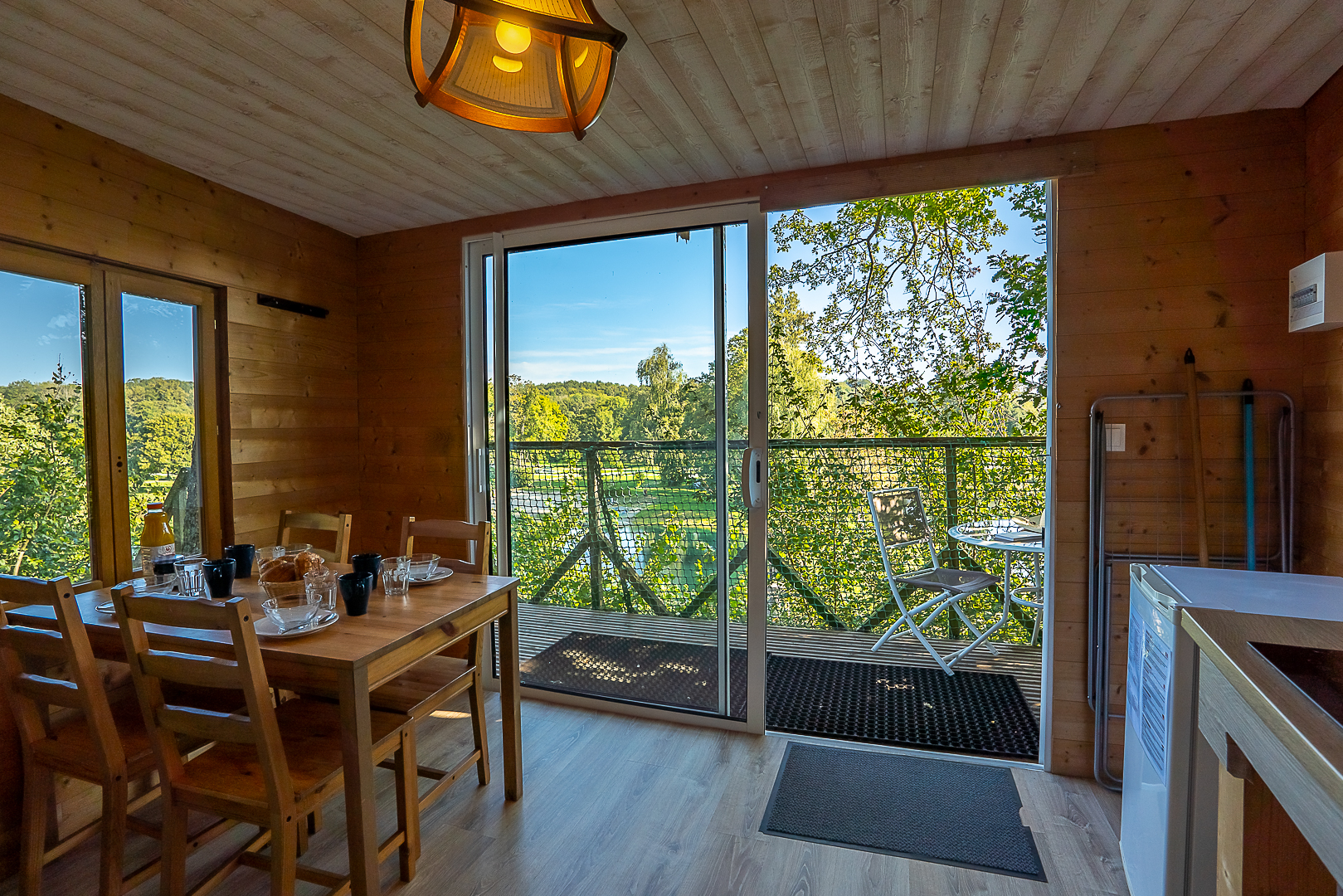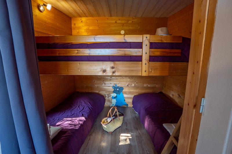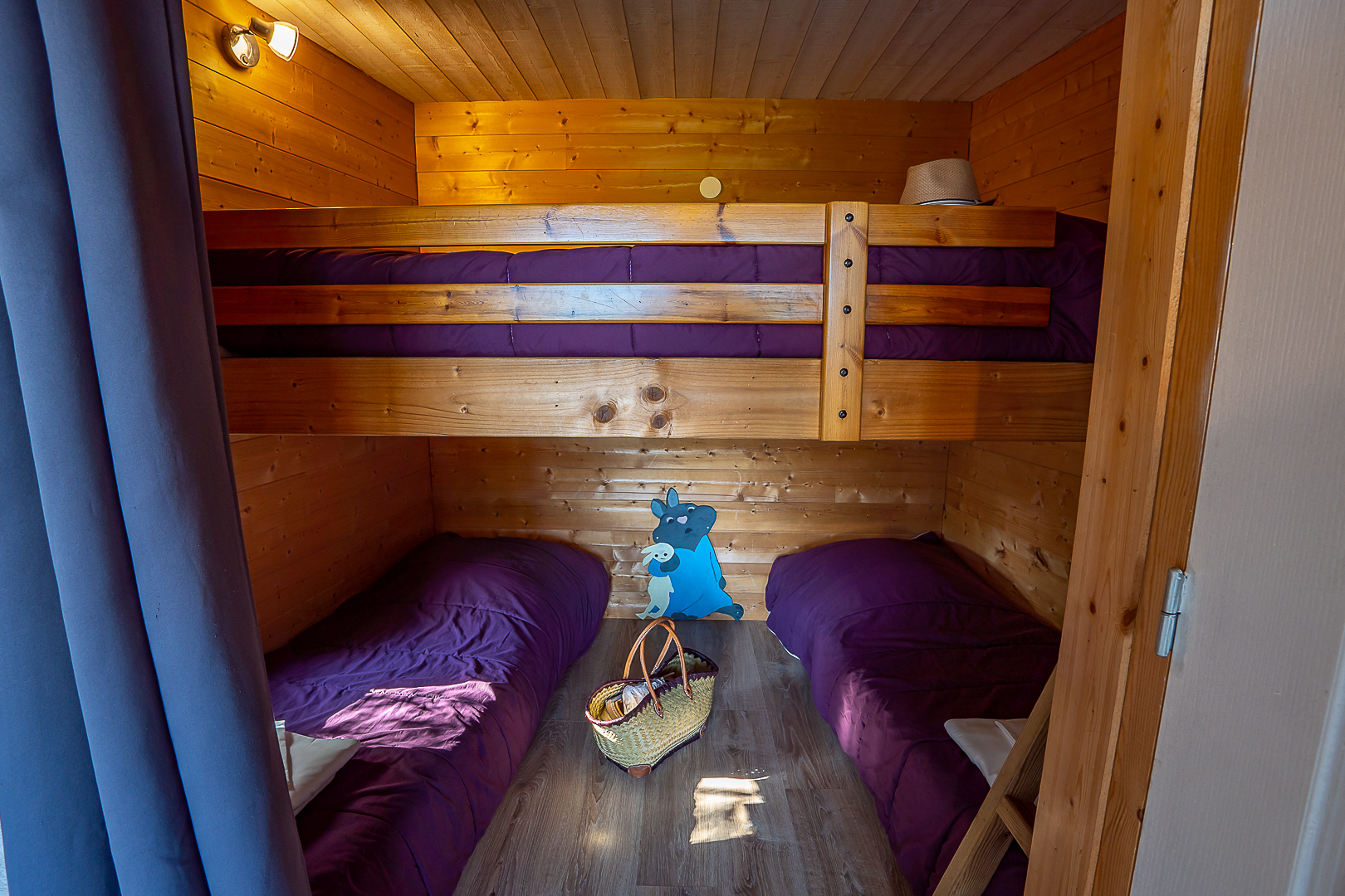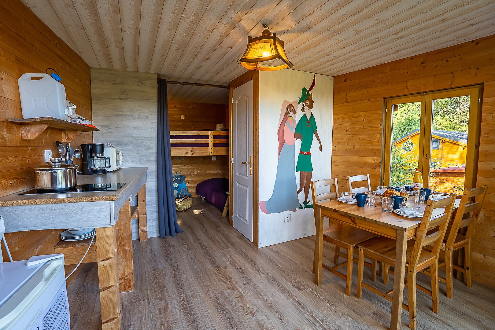 Séjour avec 1 lit double et 2 lits simples, 1 coin cuisine et repas, toilettes sèches et douches aux sanitaires communs et petite terrasse