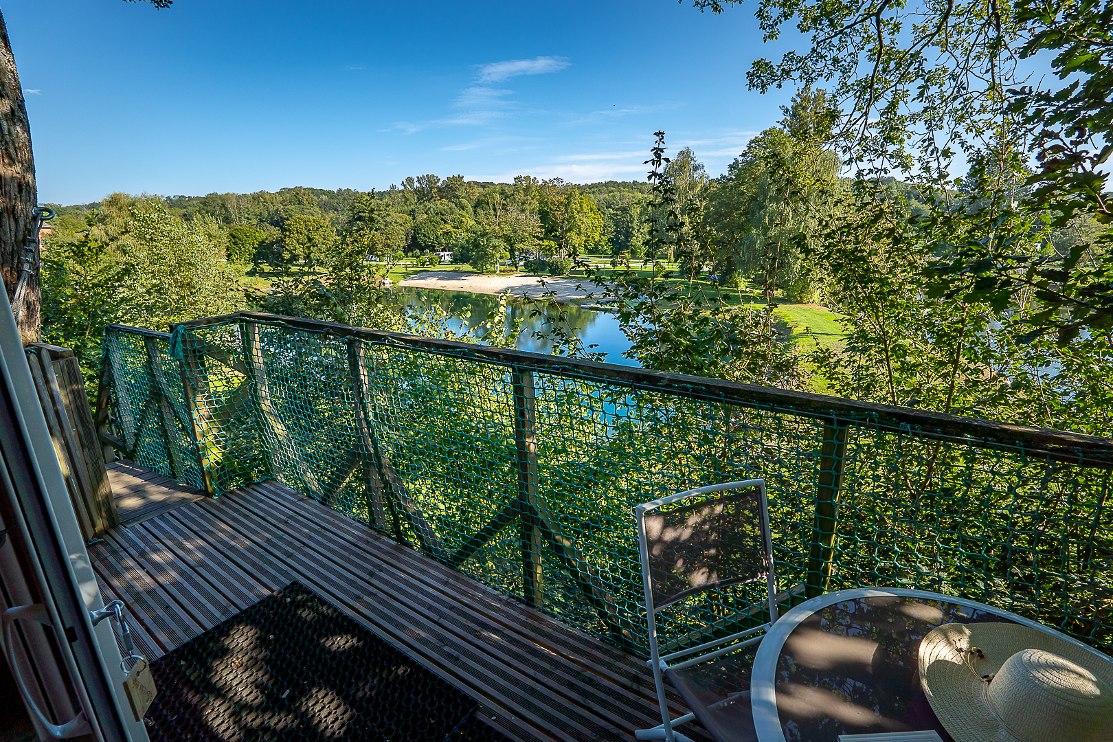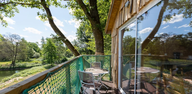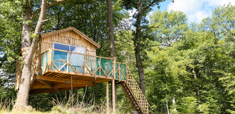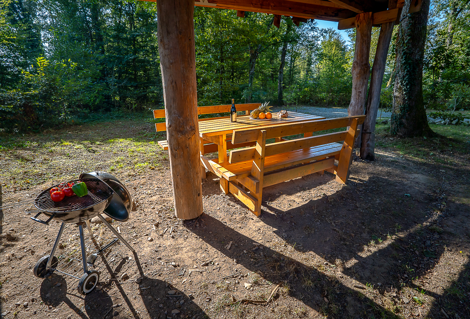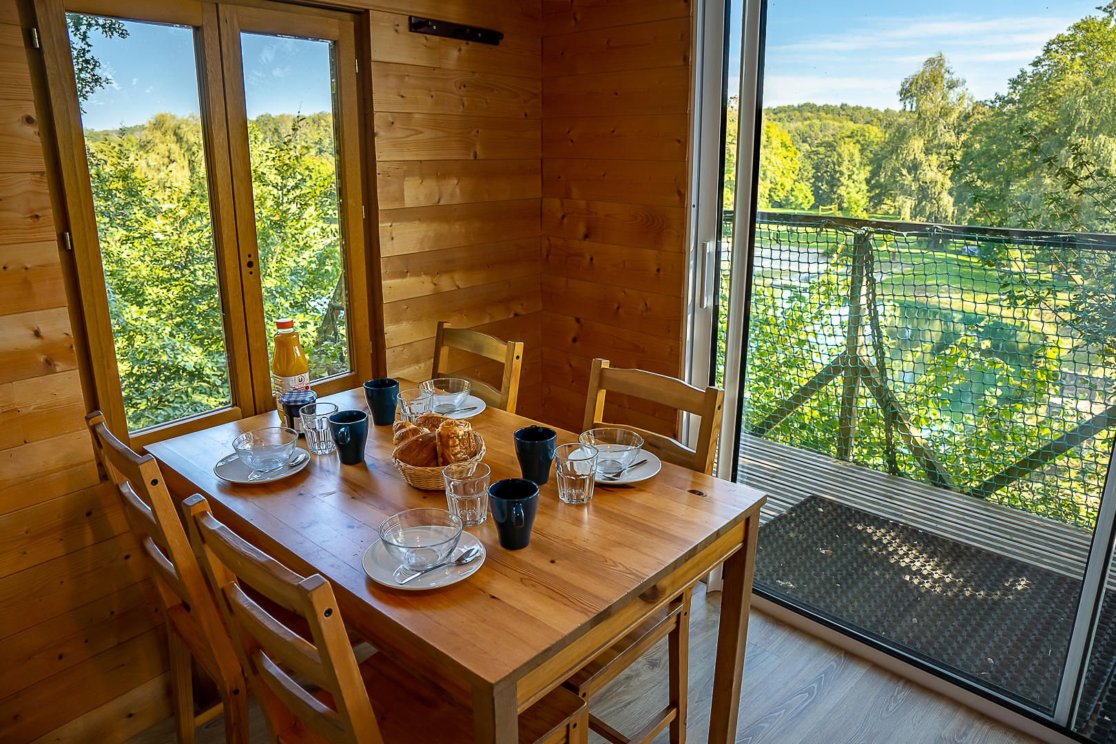 Séjour avec 1 lit double et 2 lits simples, 1 coin cuisine et repas, toilettes sèches et douches aux sanitaires communs et petite terrasse