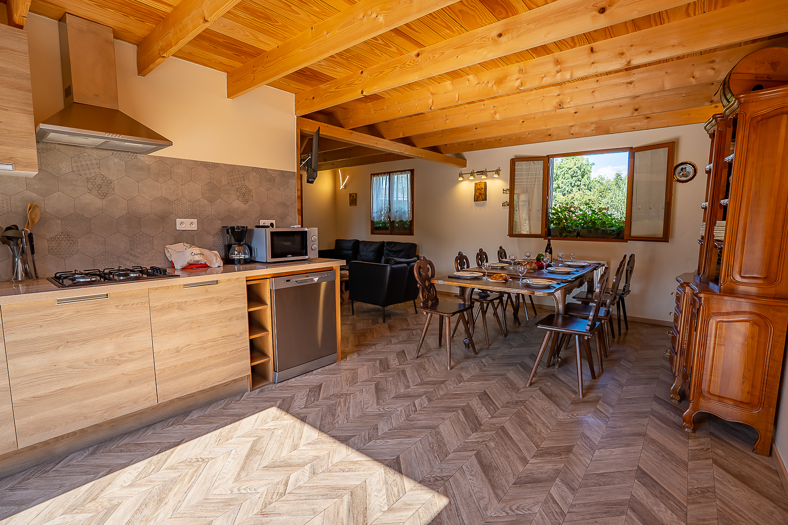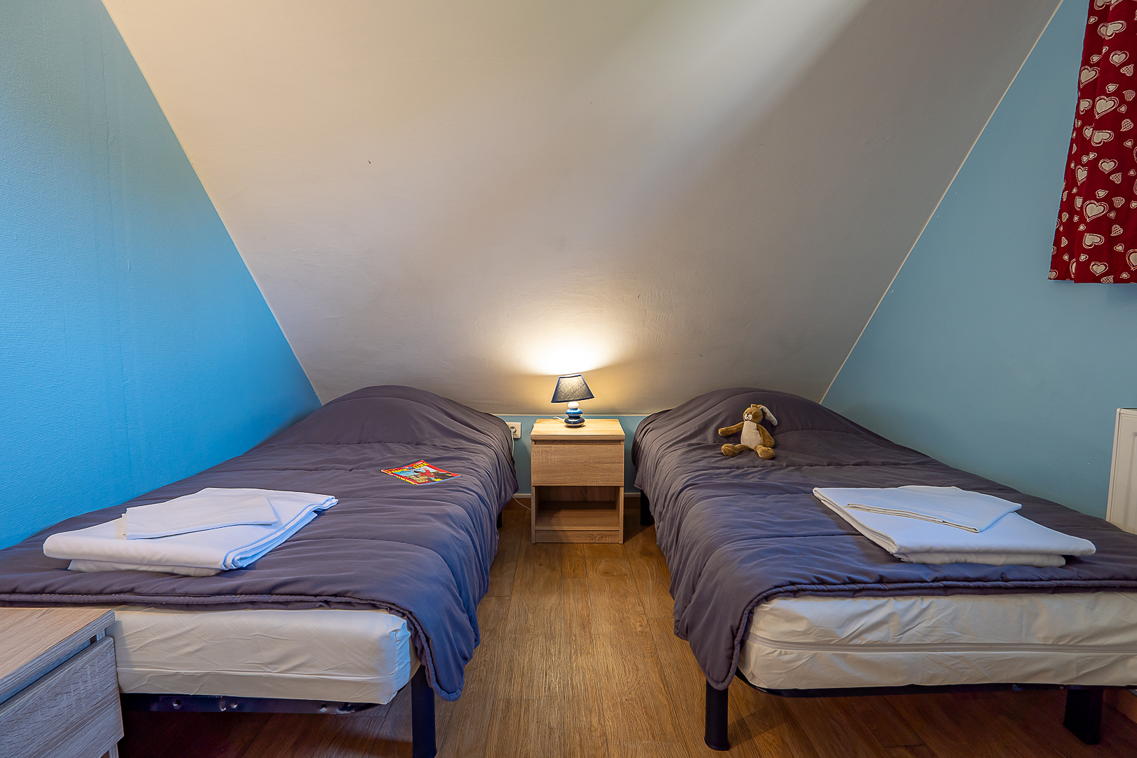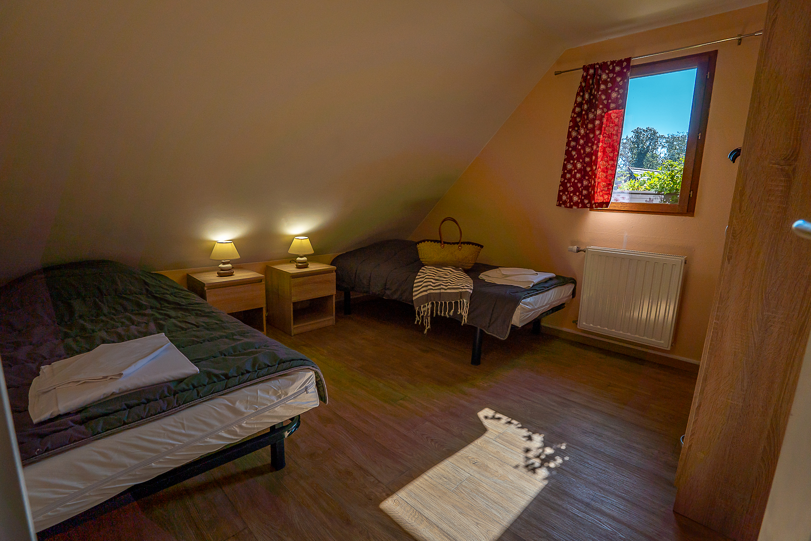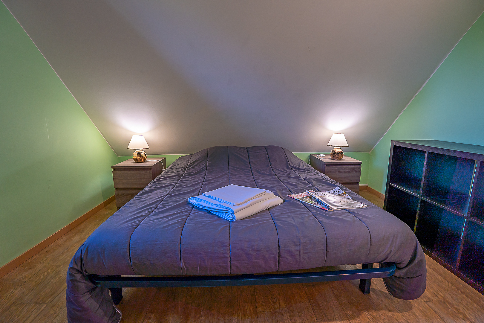 Séjour avec télé et cuisine équipée, 4 chambres dont une avec un lit double, 1 salle de bain et 1 WC, une terrasse avec barbecue