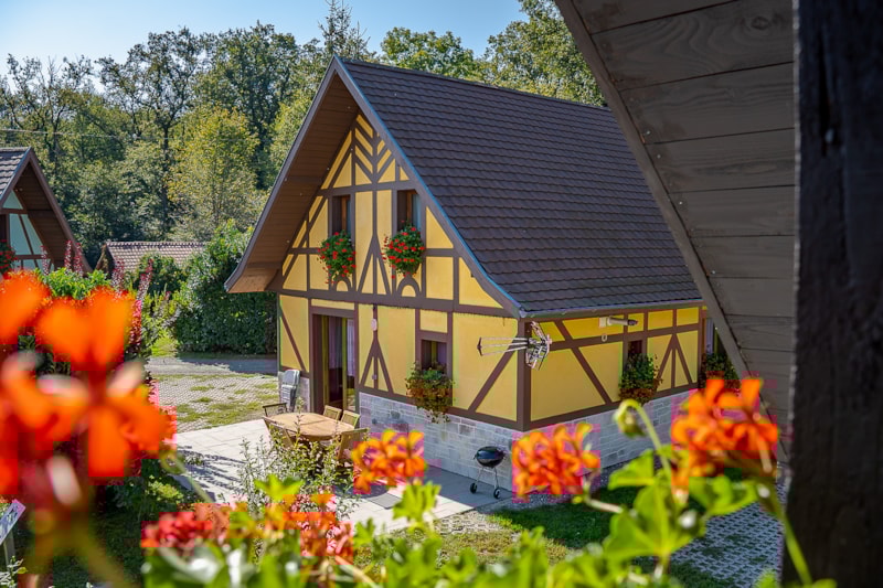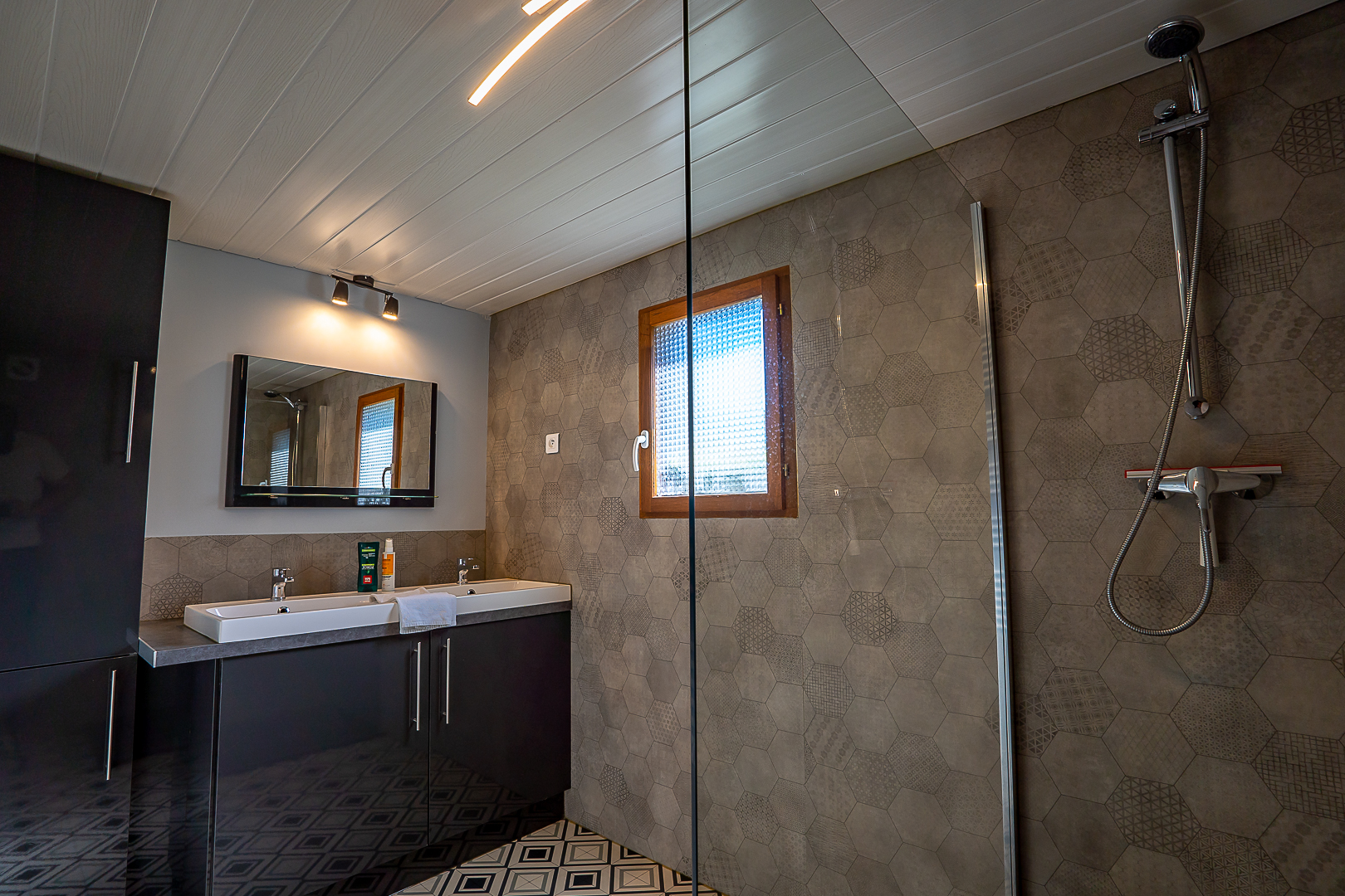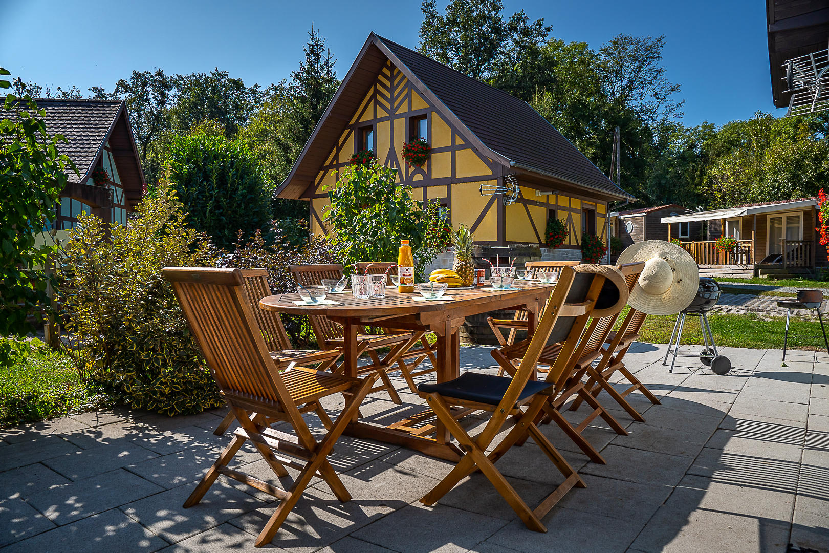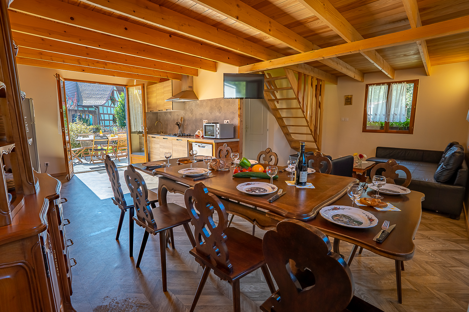 Séjour avec télé et cuisine équipée, 4 chambres dont une avec un lit double, 1 salle de bain et 1 WC, une terrasse avec barbecue