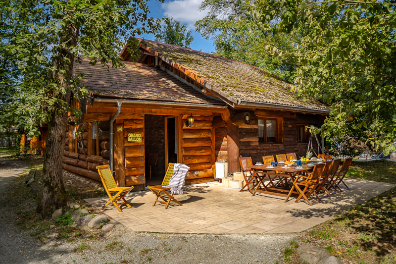 Séjour avec télé et cuisine équipée, 4 chambres avec 2 lits simples et 1 mezzanine avec 2 lits simples et 1 salle de bain et 1 WC, une terrasse couverte avec barbecue.
