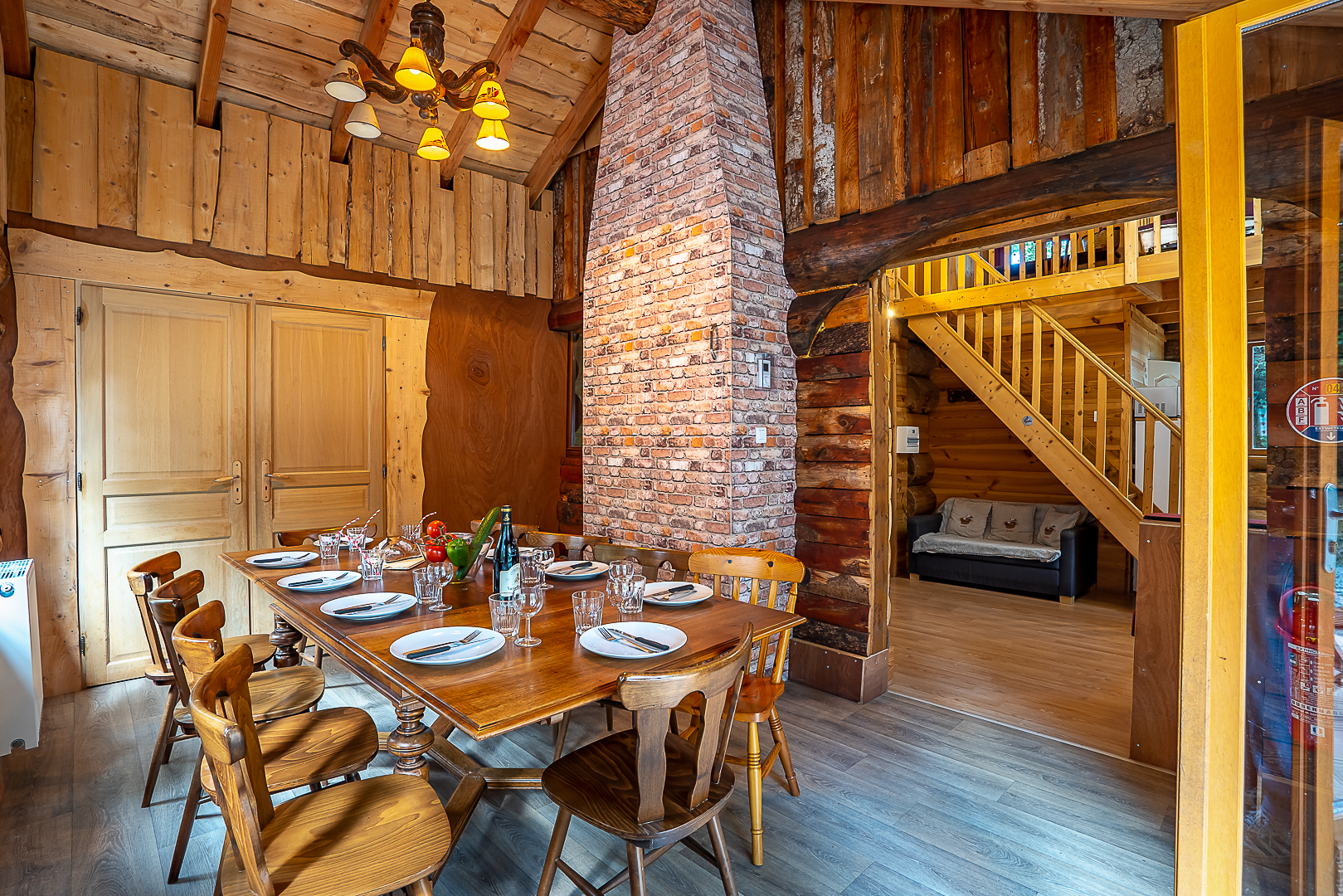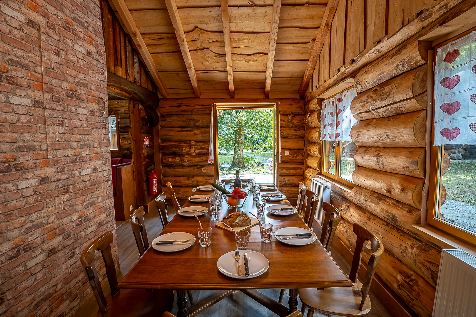 Séjour avec télé et cuisine équipée, 4 chambres avec 2 lits simples et 1 mezzanine avec 2 lits simples et 1 salle de bain et 1 WC, une terrasse couverte avec barbecue.