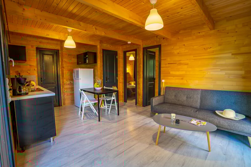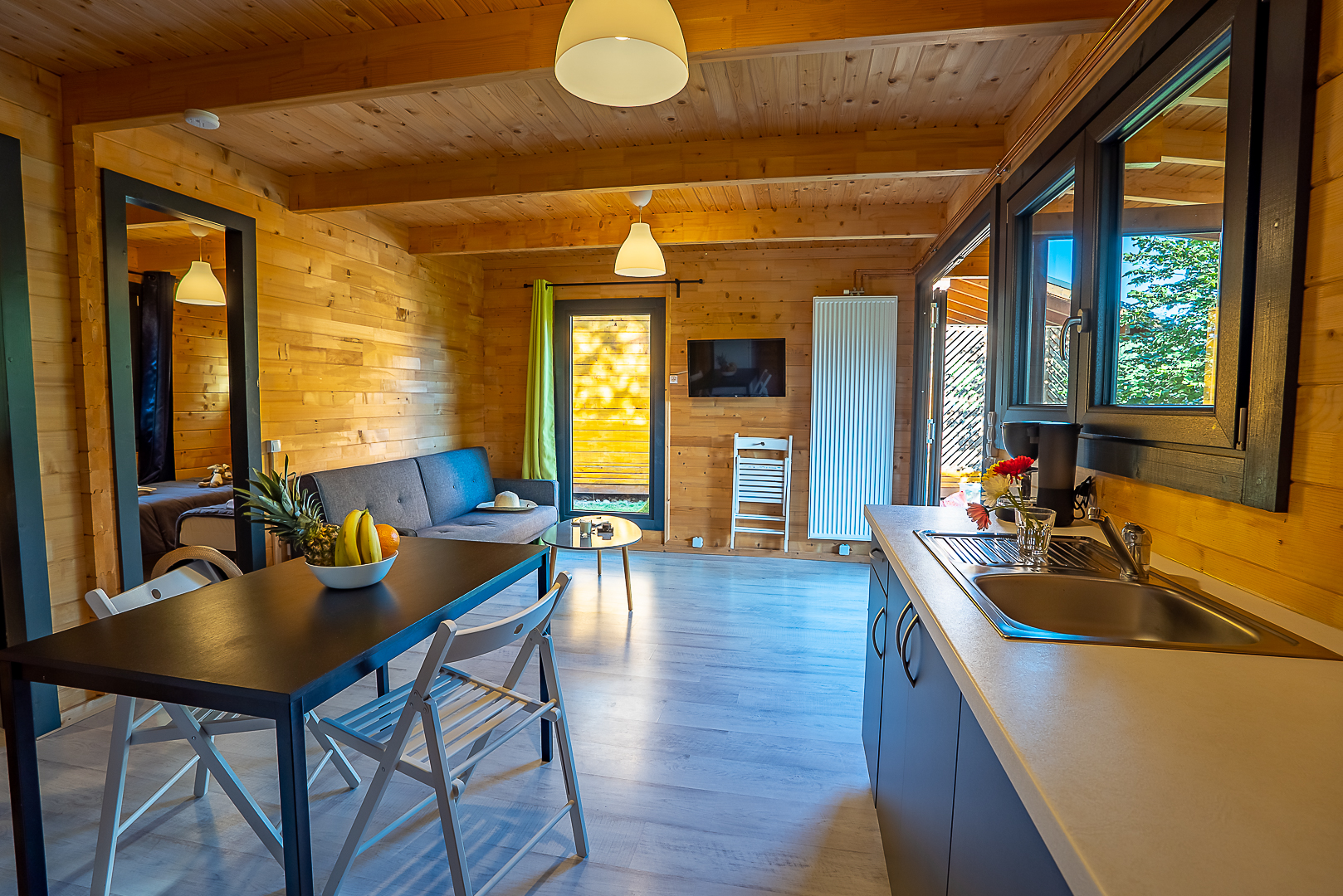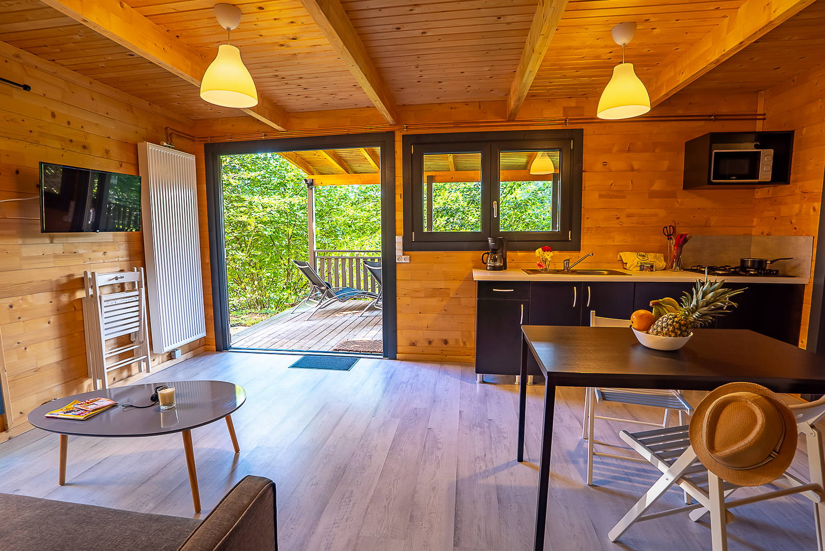 Séjour avec télévision et cuisine équipée.