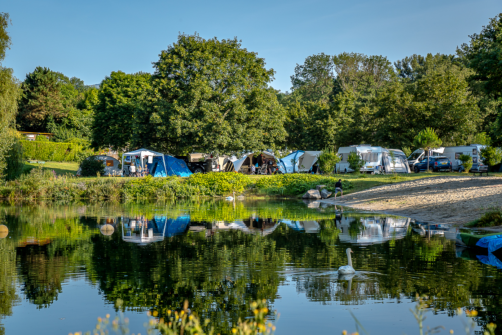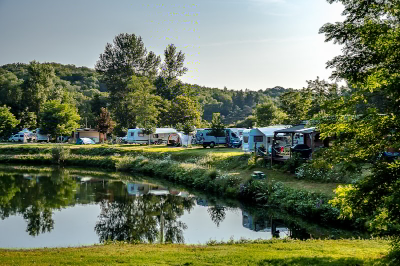 Emplacement de camping avec eau et écoulement sur l'emplacement.
