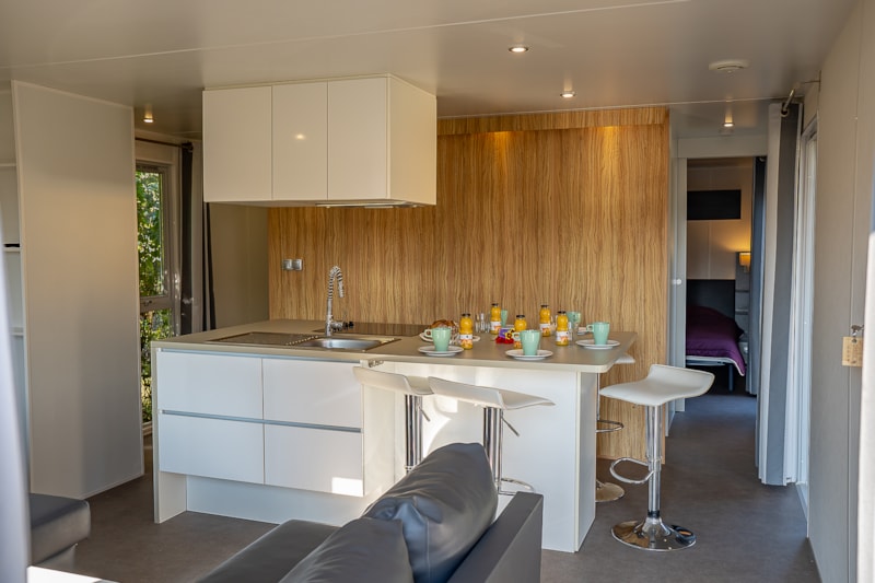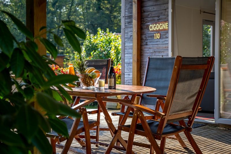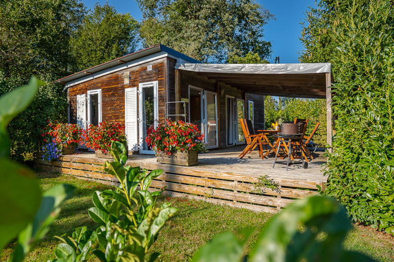 Séjour avec télé et cuisine équipée, 2 chambres dont une avec un lit double et une avec 1 lit simple et 1 lit superposé, 1 salle de bain et 1 WC, une terrasse couverte avec barbecue