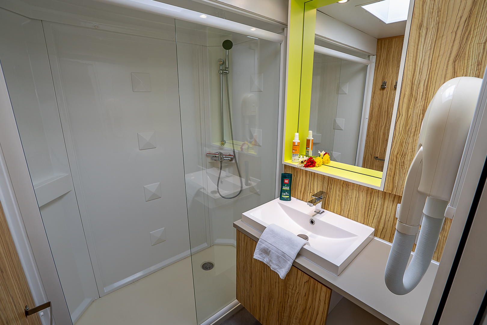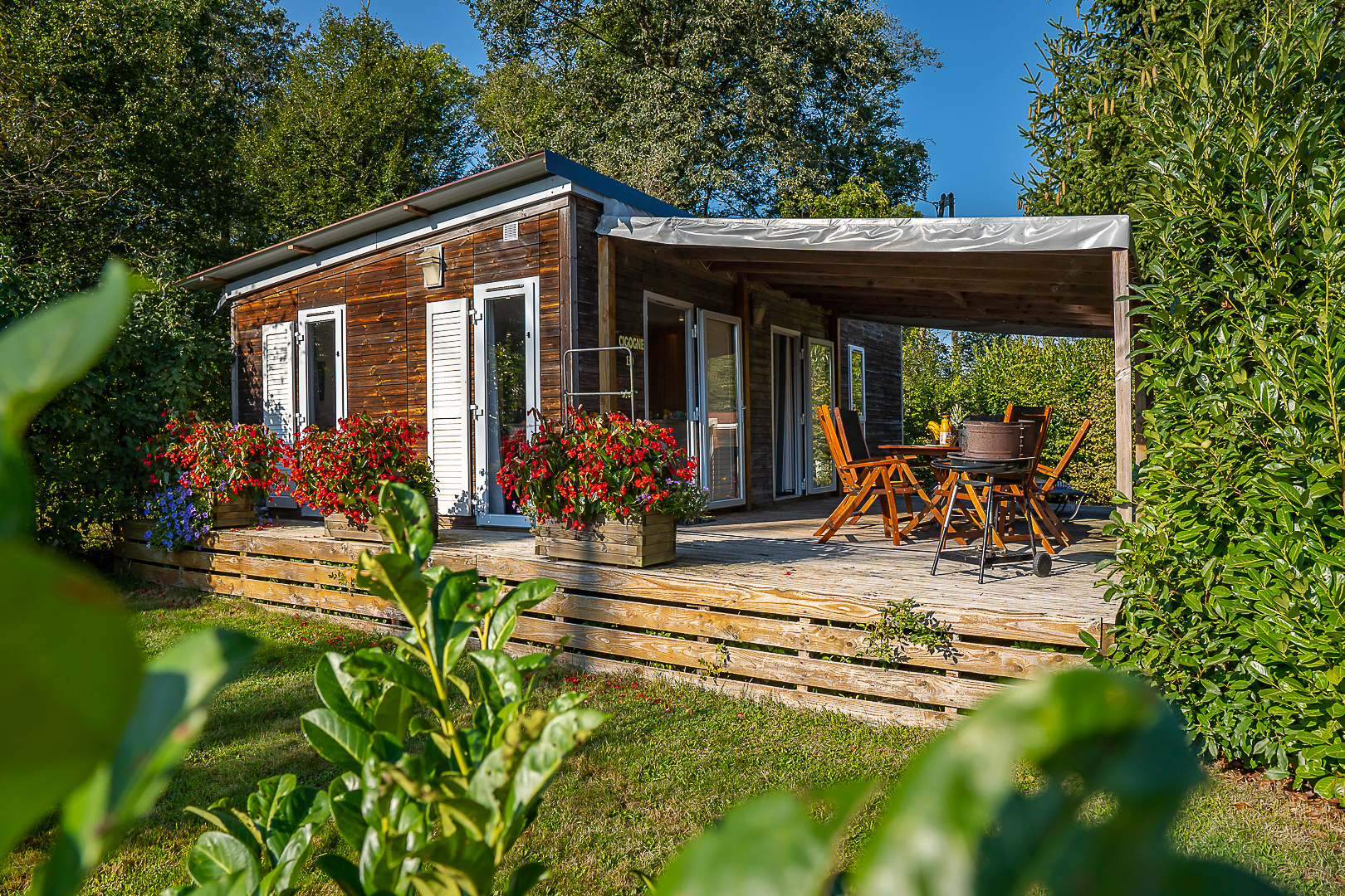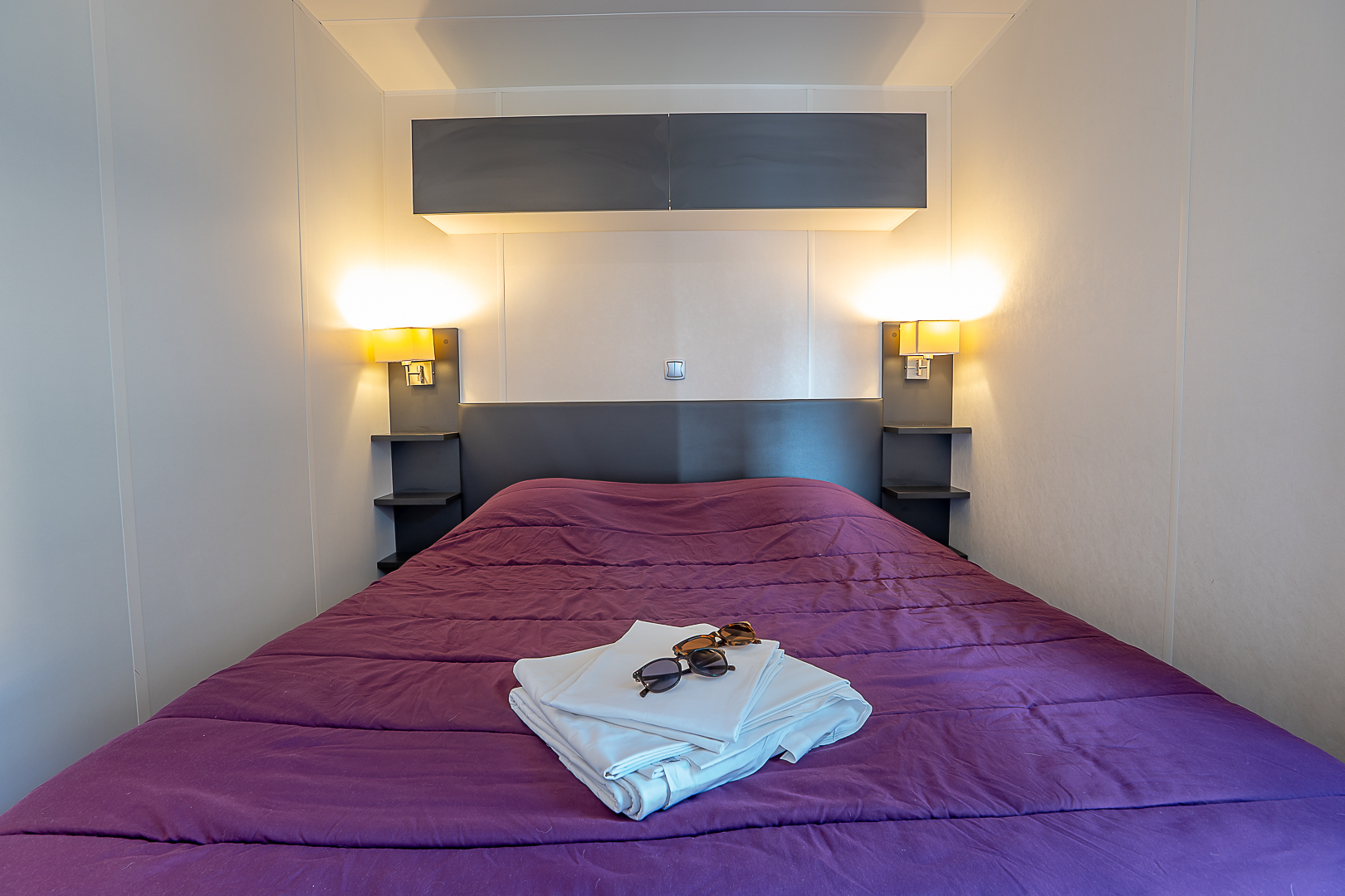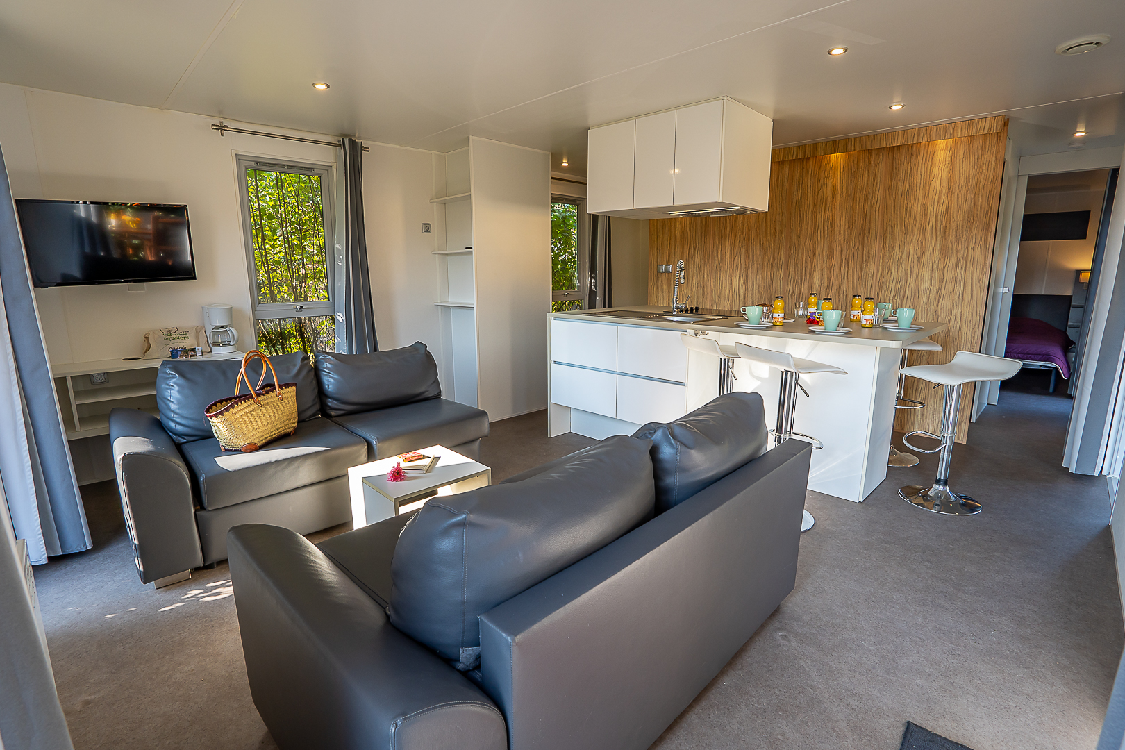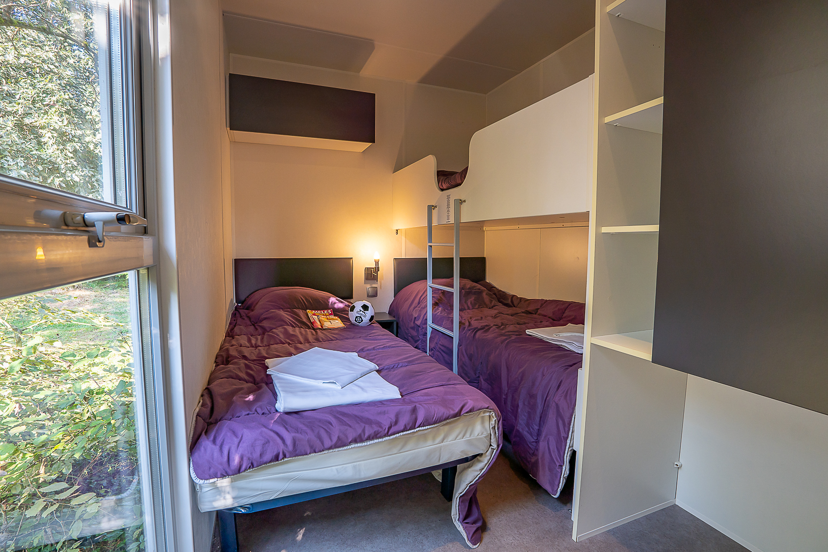 Séjour avec télé et cuisine équipée, 2 chambres dont une avec un lit double et une avec 1 lit simple et 1 lit superposé, 1 salle de bain et 1 WC, une terrasse couverte avec barbecue
